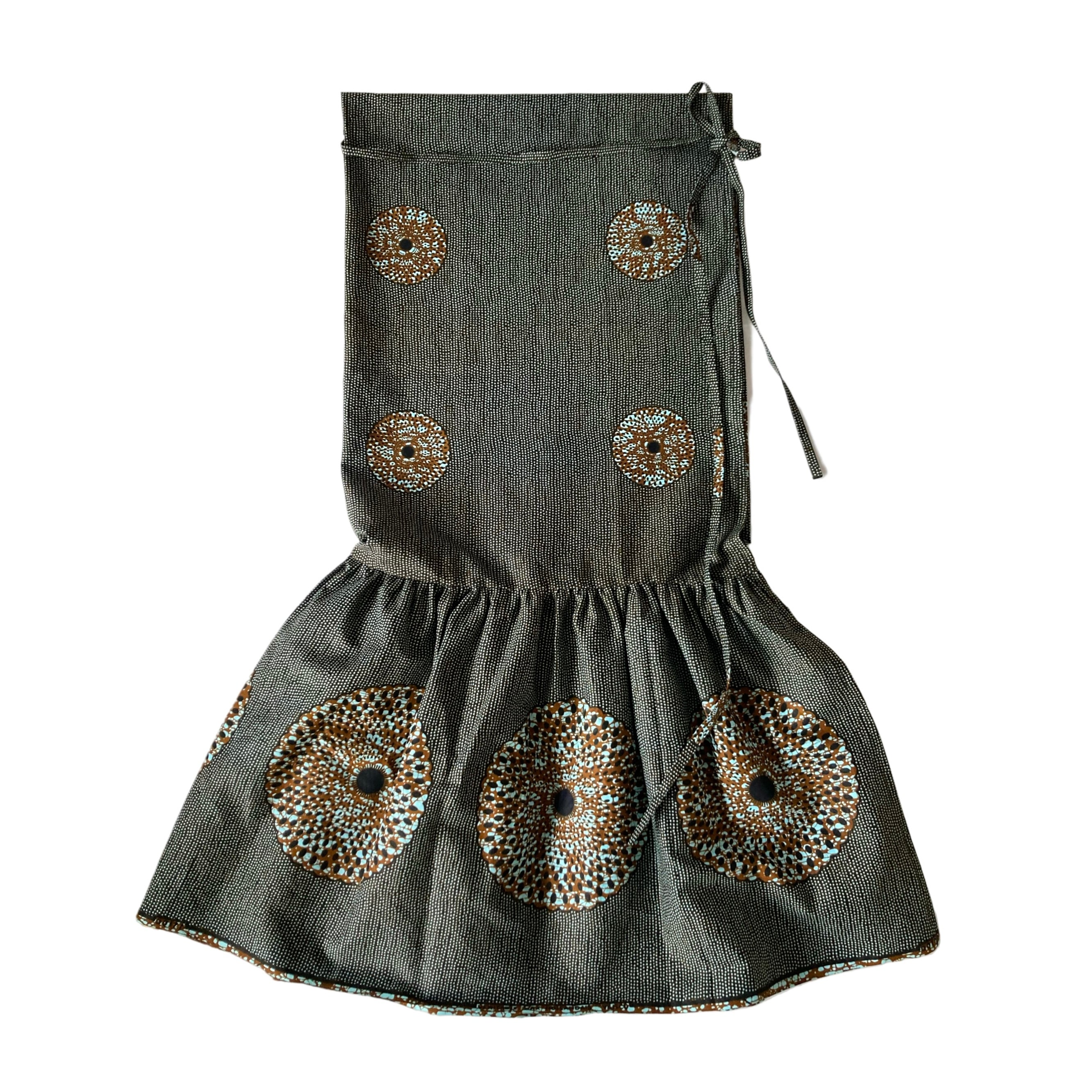 細長い共布の紐もポイントで、1本はウエスト部分に巻き付けて、もう1本は長く垂らして着たら可愛いです♪